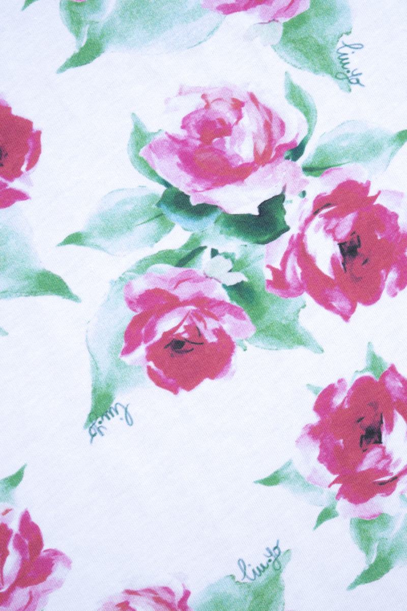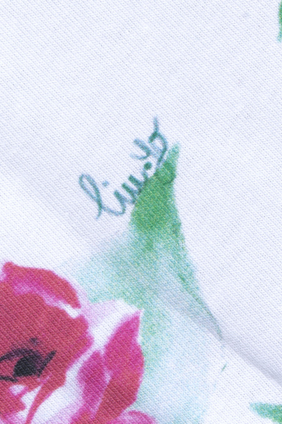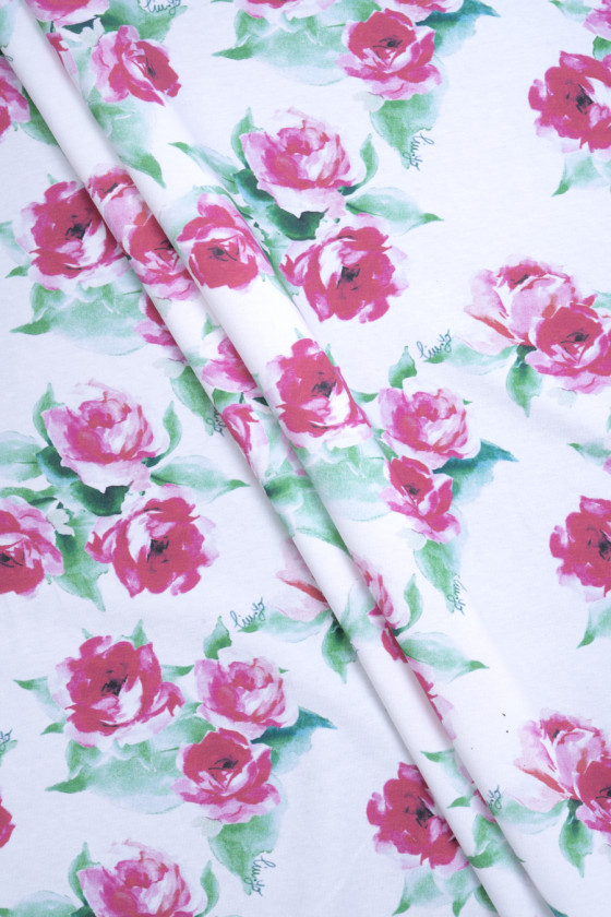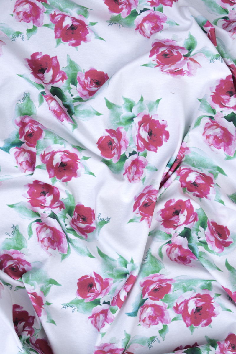 Itališkas medvilninis megztas audinys su rožių gėlių motyvu, kuris sudaro daugybę dviejų ir trijų gėlių puokščių. Visa tai palaikoma raudona, rožinė, žalia kremo fone. Audinys yra elastingas su megztu pynimu, labai malonus liesti. Be to, jis pasirašytas gerai žinomo mados prekės ženklo pavadinimu. Puikus pasiūlymas siūti vasarinę palaidinę ar suknelę firminių, gėlėtų audinių gerbėjams.