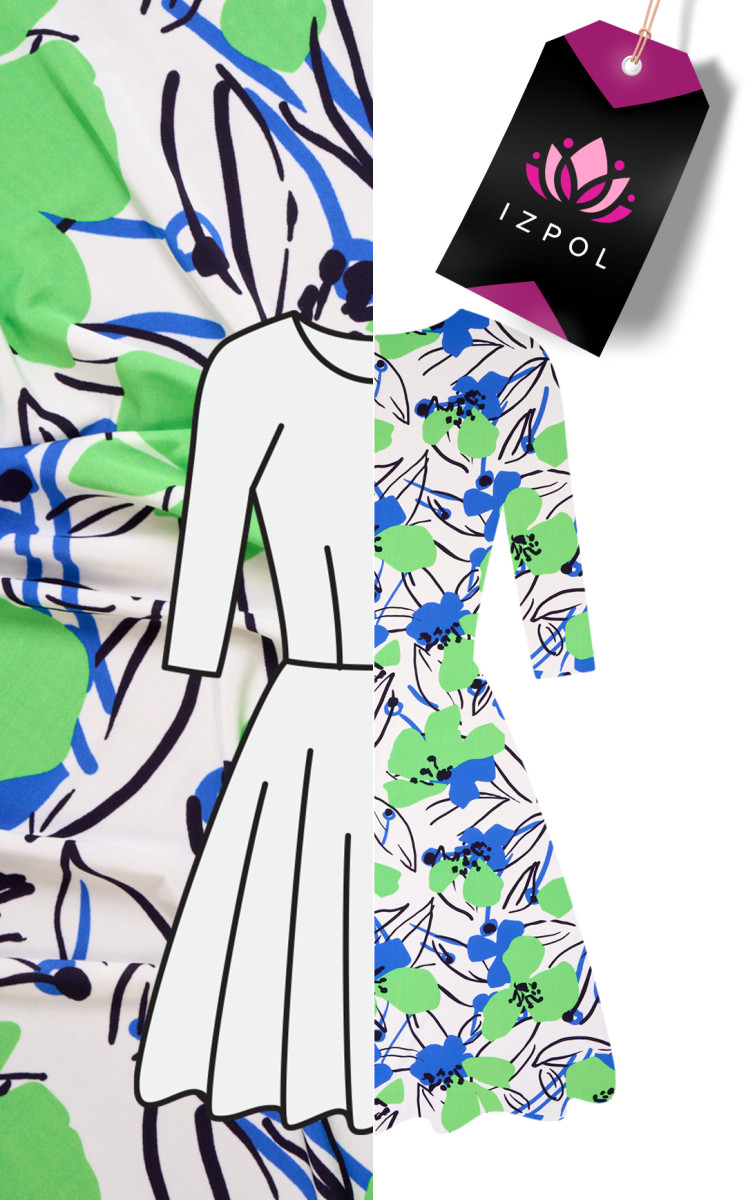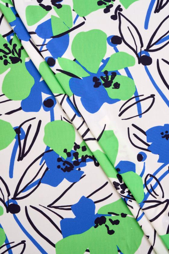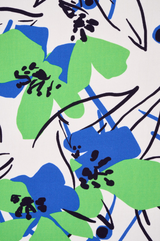 Itališkas viskozės megztas audinys kreminiame fone, didelės gėlės energingomis žalios ir rugiagėlės spalvomis ir juodais lapų kontūrais. Megztas audinys yra elastingas, aušinantis liesti, nepermatomas ir tekantis. Viskozės megztas audinys yra natūralus audinys (gaunamas iš celiuliozės), labai minkštas ir erdvus. Puikus pasiūlymas sukurti suknelę, sijoną ar palaidinę.