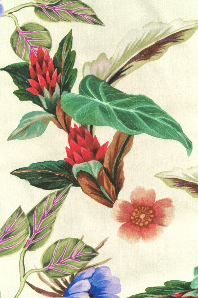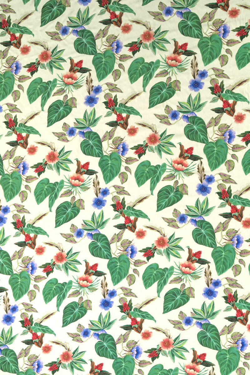 Itališkas 100% viskozės audinys šviesiai smėlio spalvos su tankiu egzotinių gėlių ir lapų motyvu. Atspaudas buvo pagamintas žalios ir fuksijos spalvomis. rugiagėlių, smėlio ir raudonos spalvos. Audinys yra minkštas ir nepermatomas su paprastu pynimu, labai malonus liesti. Ši rūšis puikiai tinka karštoms vasaros dienoms.