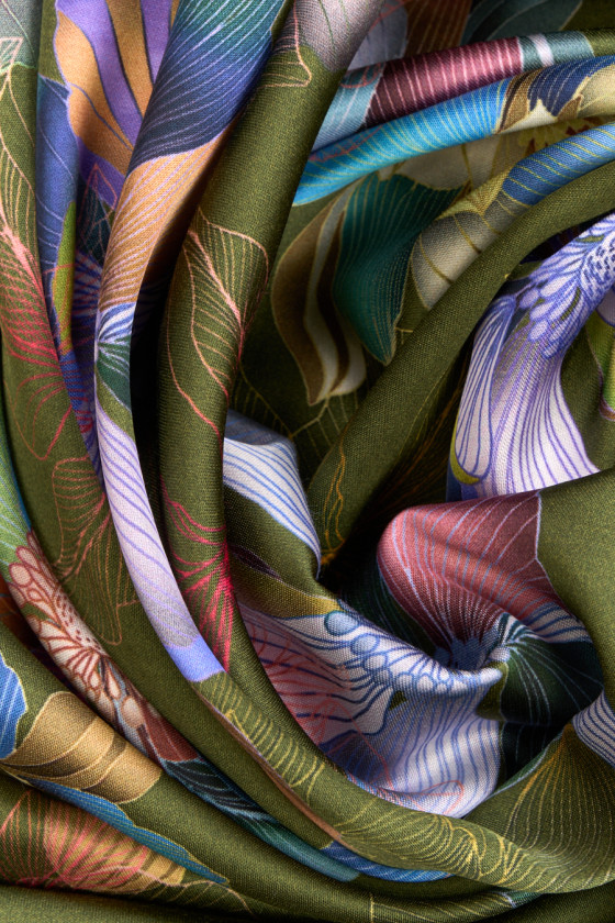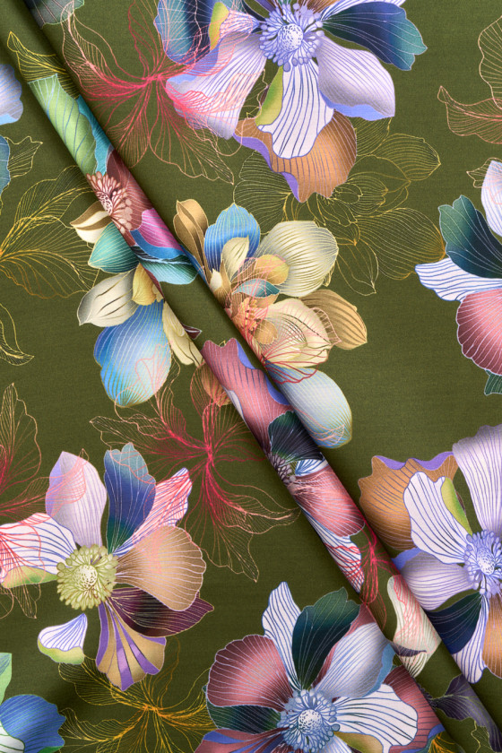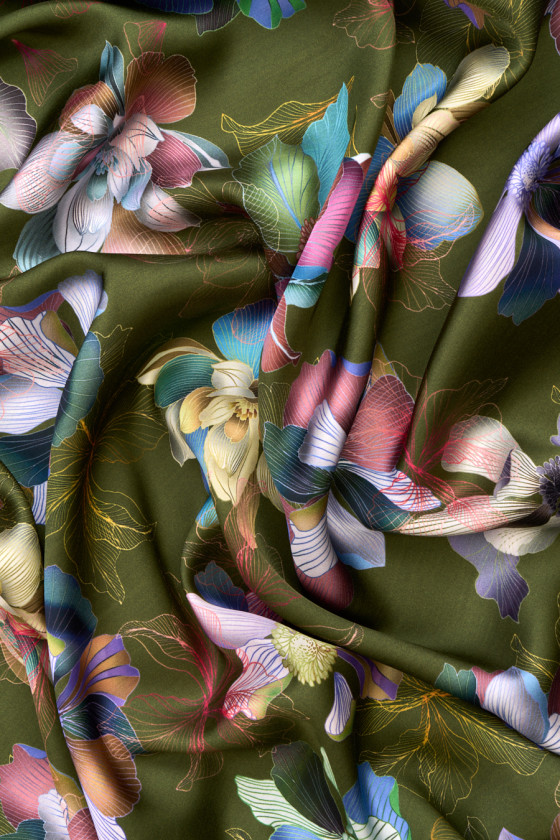 Itališkas viskozės satinas su spalvingų, didelių gėlių motyvu žaliame fone. Tankiai išdėstytas gėlių raštas, pagamintas iš rudens spalvų, gėlės 14 cm * 15 cm. Audinys yra neelastingas, tekantis, subtilus liesti, minkštas ir gražiai priglunda. Fantastiškas pasiūlymas žmonėms, ieškantiems unikalių ir įdomių medžiagų marškiniams, sijonams, suknelėms ar šalikams.