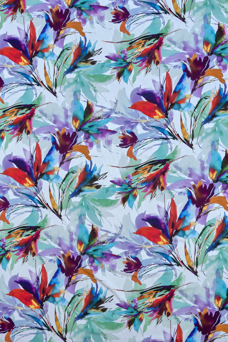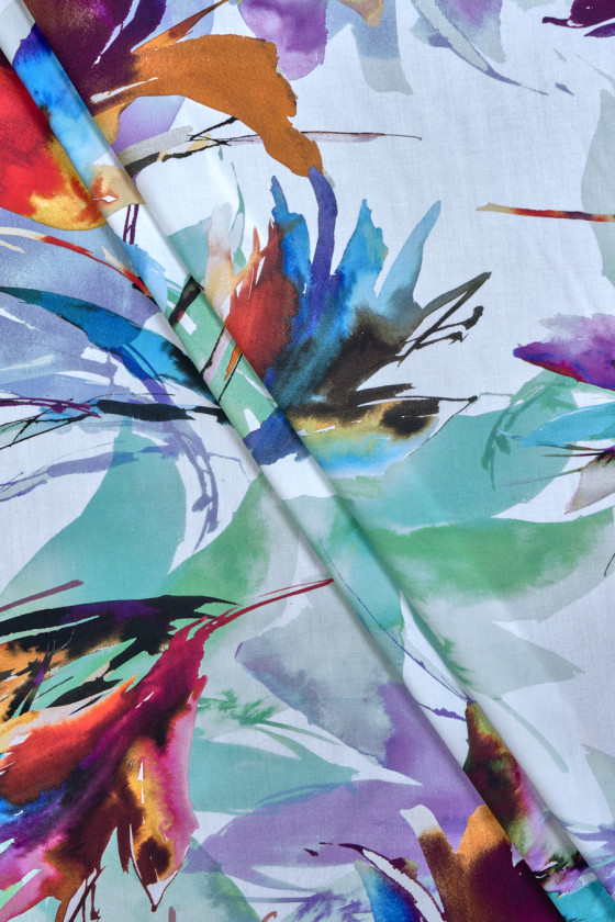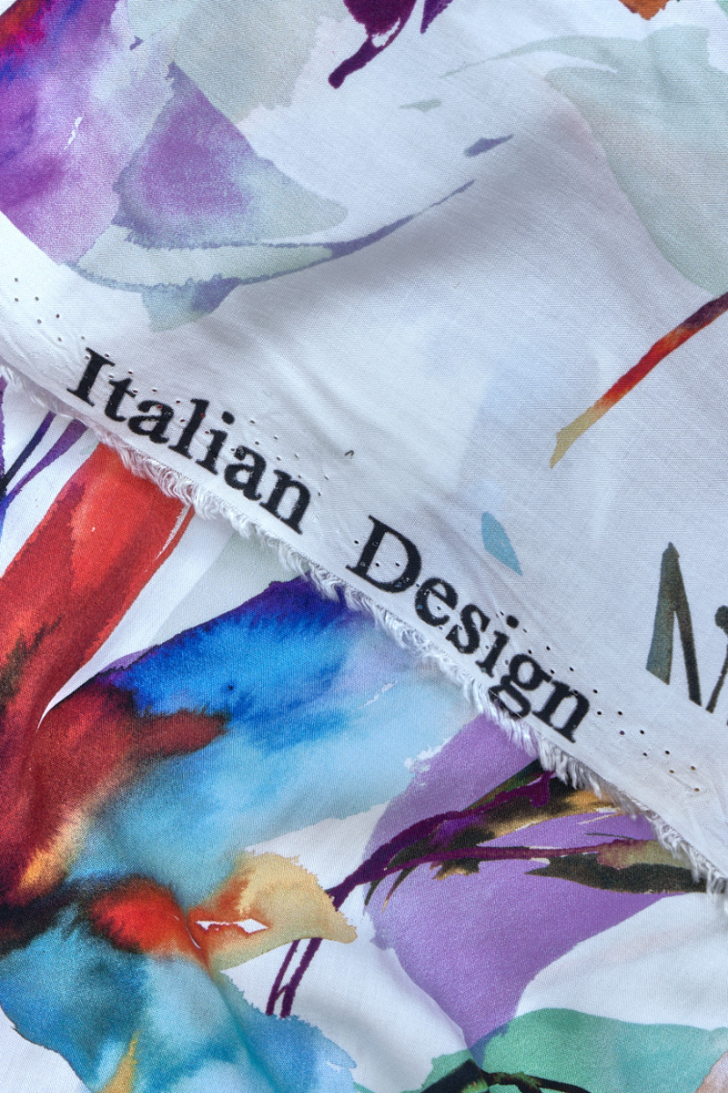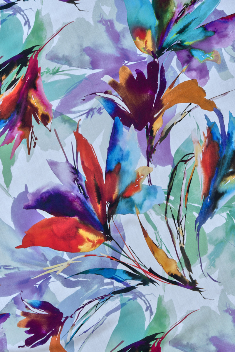 Itališkas audinys 100% viskozė su didelėmis, neryškiomis gėlėmis žalios, raudonos ir violetinės spalvos baltame fone. Audinys yra minkštas, tekantis, lengvas ir labai malonus liesti. Puikus pasiūlymas, iš kurio galite siūti marškinius, palaidinę, suknelę ar sijoną.