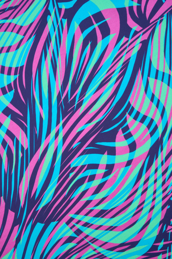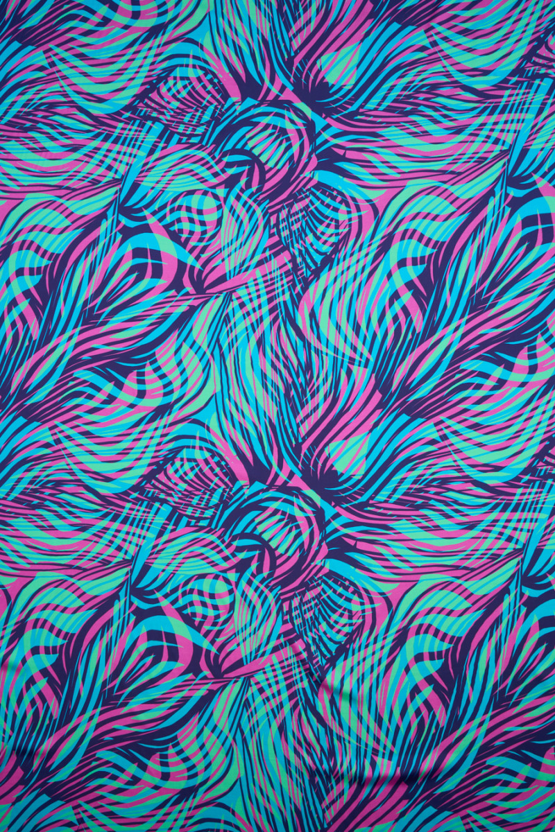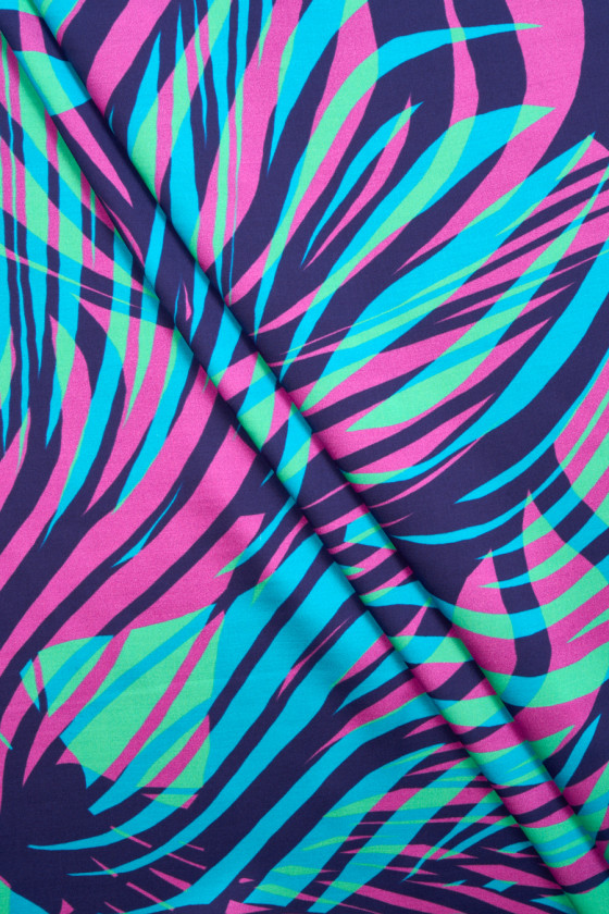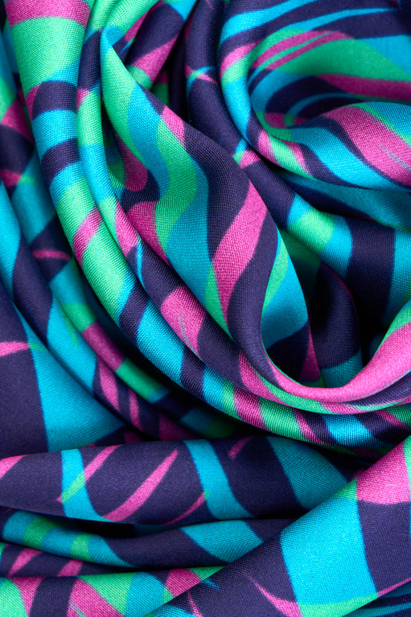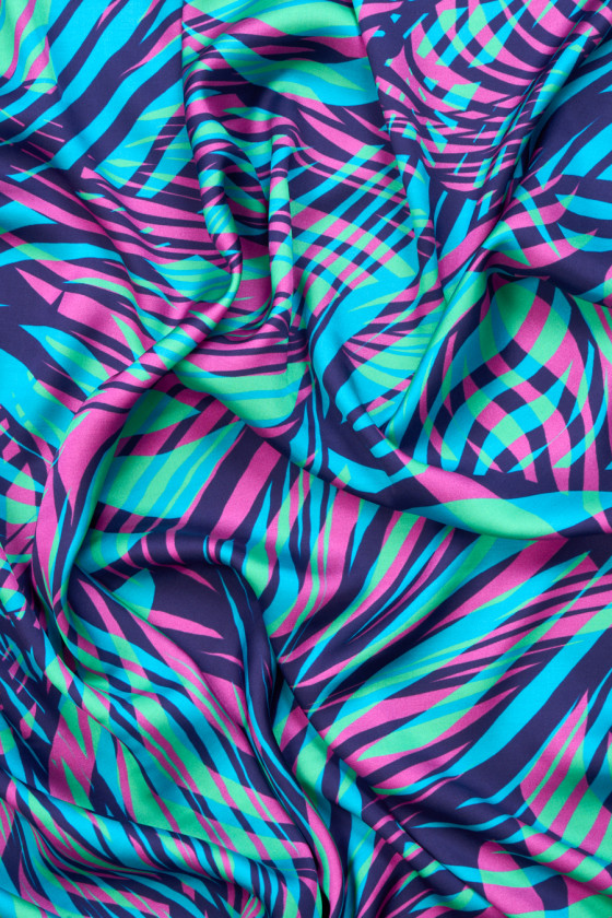 Itališkas audinys 100% viskozė su netaisyklingu bangų raštu, pagamintas iš energingų fuksijos, turkio ir žalios spalvos. Audinys yra satinas, minkštas, tekantis, lengvas ir labai malonus liesti. Puikus pasiūlymas unikaliai aprangai, tokiai kaip suknelės, sijonai, palaidinės ir marškiniai.