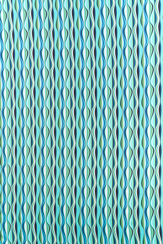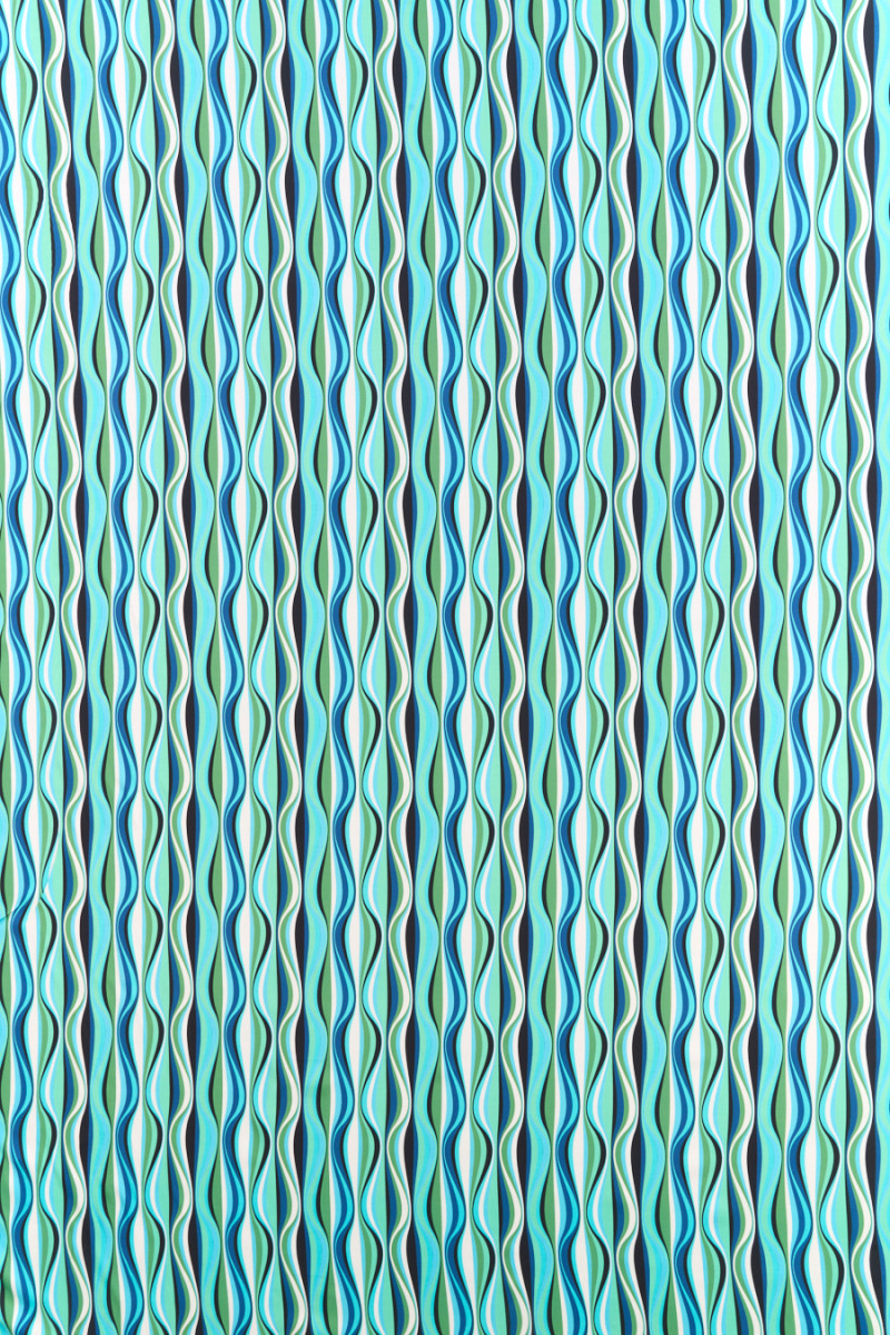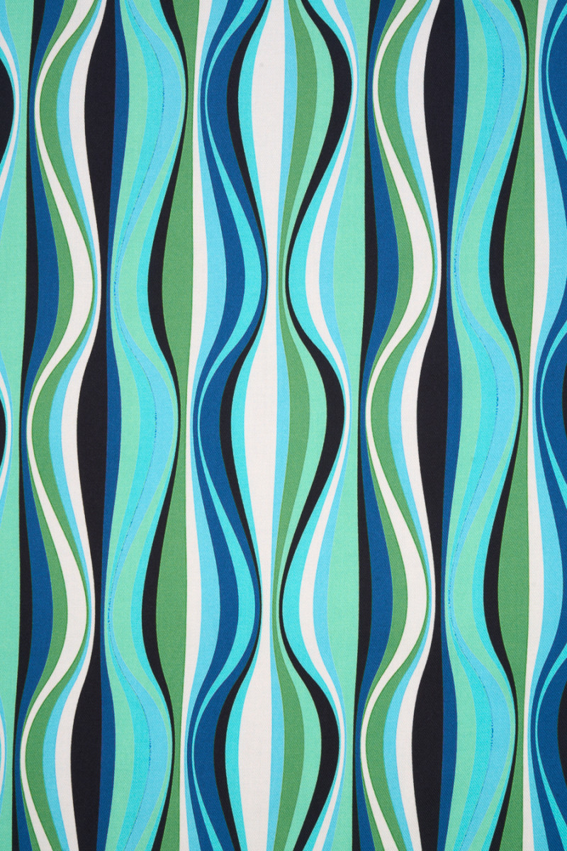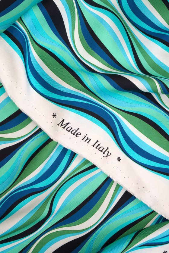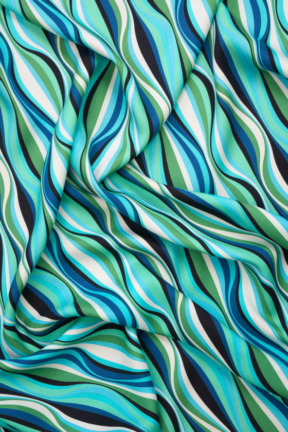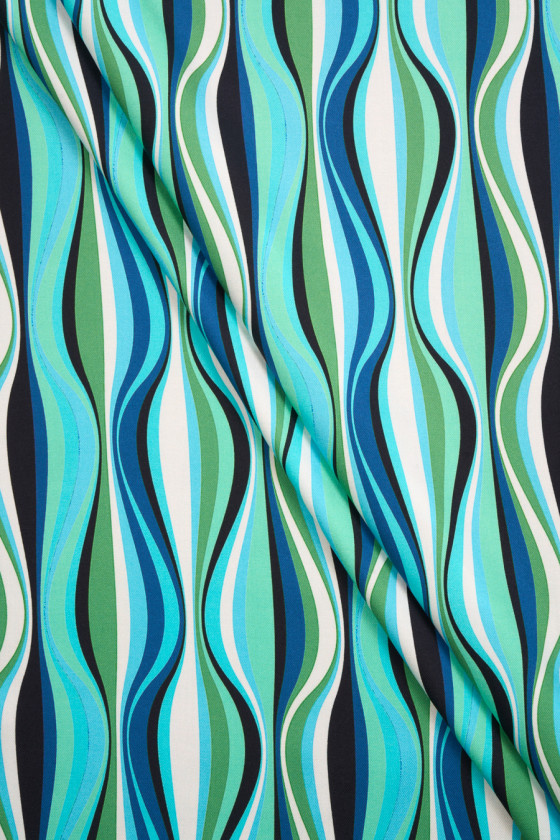 Itališkas audinys 100% viskozė su bangos modeliu turkio, žalios, grietinėlės ir juodos spalvos. Audinys yra minkštas, matinis, tekantis, nepermatomas ir labai malonus liesti. Spalvingas pasiūlymas, iš kurio galite siūti suknelę, sijoną, palaidinę ar šortus.