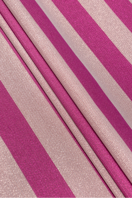 Elegantiškas žakardas su 4 cm pločio juostelėmis šviesiai rausvos ir rožinės spalvos, kurios spindi lurekso siūlais.