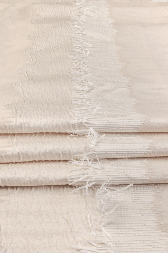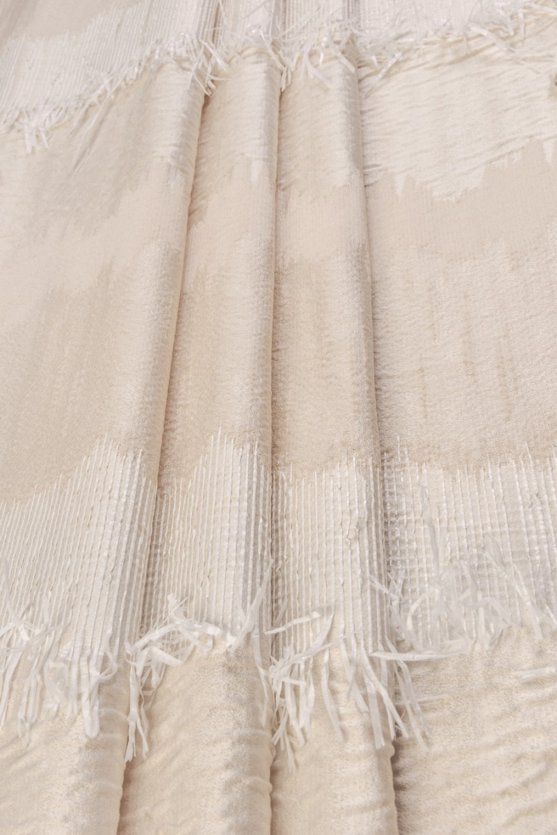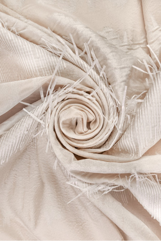 Elegantiškas žakardas šviesiai smėlio spalvos su ecru skersiniu bangų modeliu su rafijos kutais. Mes siūlome siūti audinį perimetriškai, idealus pasiūlymas suknelėms, sijonams ir paltams