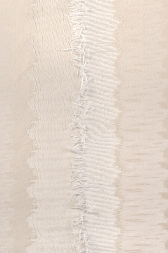Itališkas žakardo kostiumo audinys šviesiai smėlio spalvos. Labai elegantiškas audinys su keturiomis vertikaliomis, banguotomis écru juostelėmis, dekoruotomis rafijos kutais. Audinys yra plonas, bet šiek tiek standus, subtilus struktūra, jį galima siūti abiem kryptimis. Fantastiškas pasiūlymas siūti originalų kostiumą, suknelę ar sijoną.