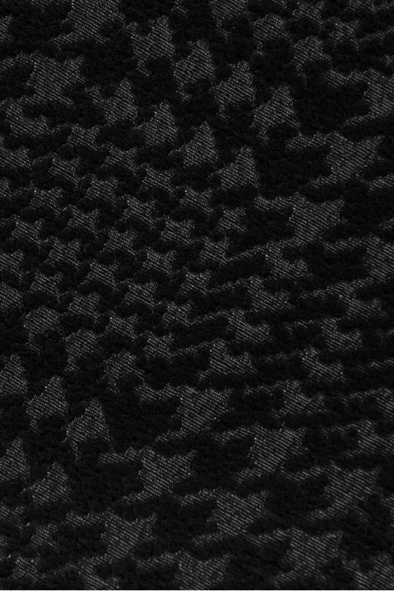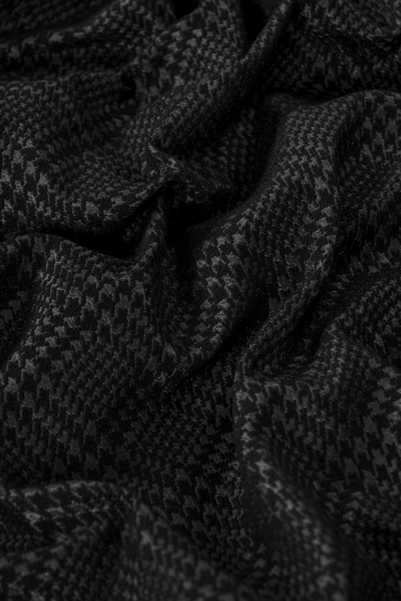 Itališkas kostiumo audinys grafito ir juodos spalvos su vištienos pėdos motyvu, kuris sudaro čekį (apie 3 cm). Raštas yra matinis, o fonas šiek tiek blizgus.