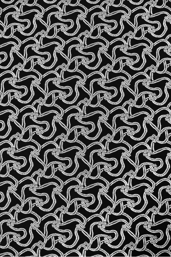 Itališkas žakardo kostiumo audinys. Labai įdomus, tankus baltų virvių modelis su mazgais juodame fone, kairėje pusėje yra priešingos spalvos - juodos virvės baltame fone ir taip pat gali būti naudojamos siuvimui. Audinys yra neelastingas, vidutinio storio su matiniu pynimu - jis primena džinsus. Tai puikiai tinka sijono, švarko ar suknelės siuvimui.