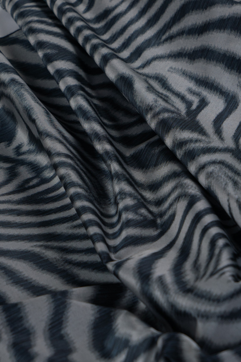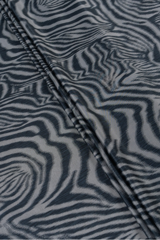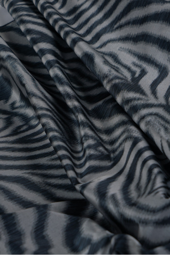 Itališkas žakardo kostiumo audinys su juodos ir pilkos spalvos zebro motyvu. Audinys yra plonas, standus, šiek tiek skaidrus, pynimas, panašus į tinklelį. Gražiai dekoruotas lurekso siūlu - blizgus, kuris suteikia jam elegancijos. Puikiai tinka suknelės, kostiumo, sijono siuvimui ar dekoratyviniais tikslais.