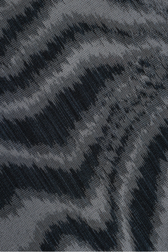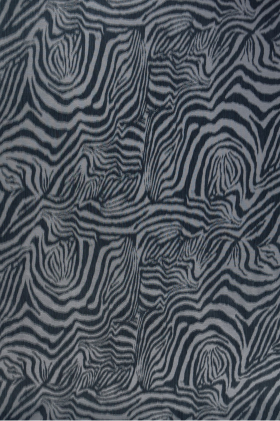 Itališkas žakardo kostiumo audinys su juodos ir pilkos spalvos zebro motyvu. Audinys yra plonas, standus, šiek tiek skaidrus, pynimas, panašus į tinklelį.