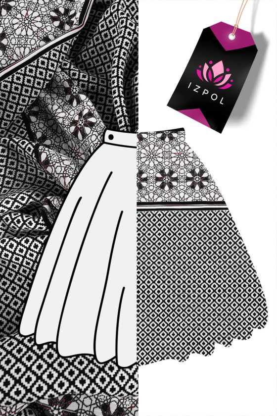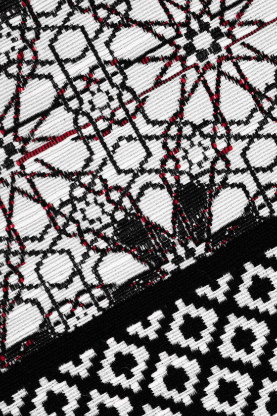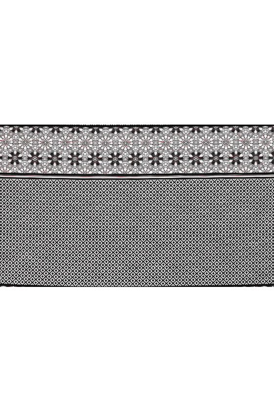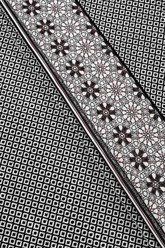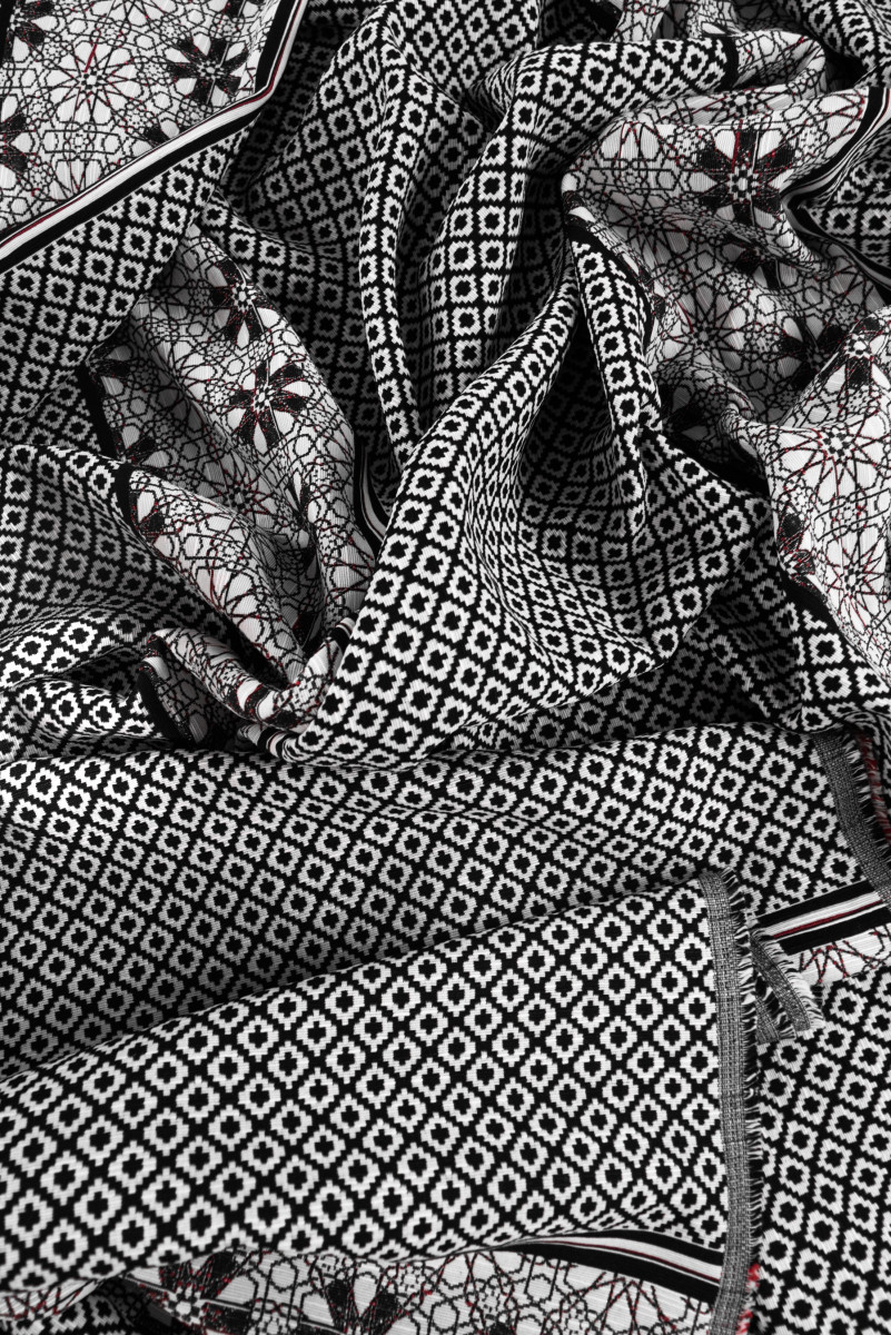 Itališkas žakardo kostiumo audinys kupono dydis 50cm * 150cm. Audinys su mažu deimanto motyvu baltos ir juodos spalvos, užpildytas juodu kryžiumi. Kupono apačia baigiama dekoratyviniu 17 cm pločio krašteliu su juodos ir bordo spalvos gėlių raštu baltame fone. Audinys yra storesnis, mėsingas - puikiai tinka kostiumo, sijono, švarko ar dekoratyviniais tikslais siūti.