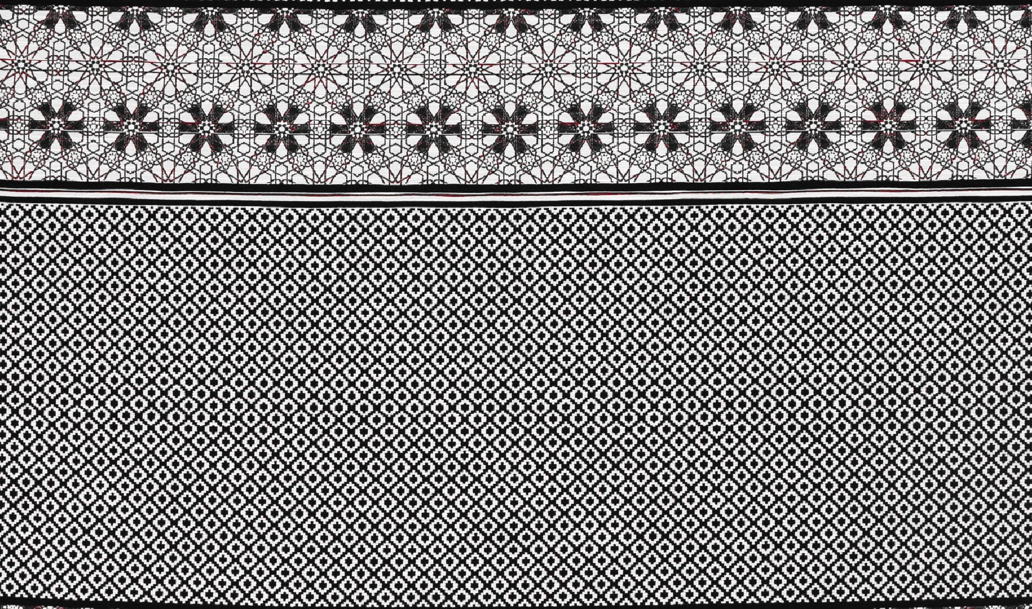 Itališkas žakardo kostiumo audinys kupono dydis 50cm * 150cm. Audinys su mažu deimanto motyvu baltos ir juodos spalvos, baigtas dekoratyvine 17 cm pločio juostele bordo spalvos su gėlių raštu.