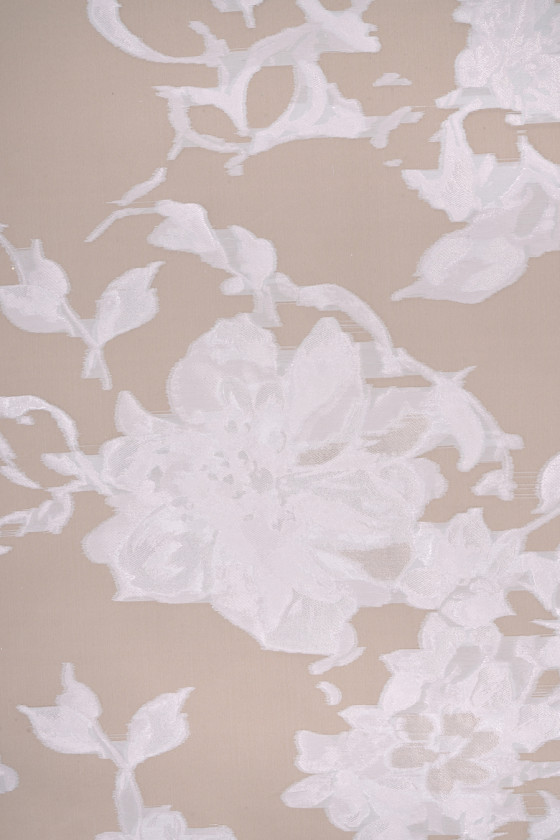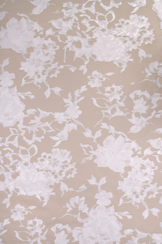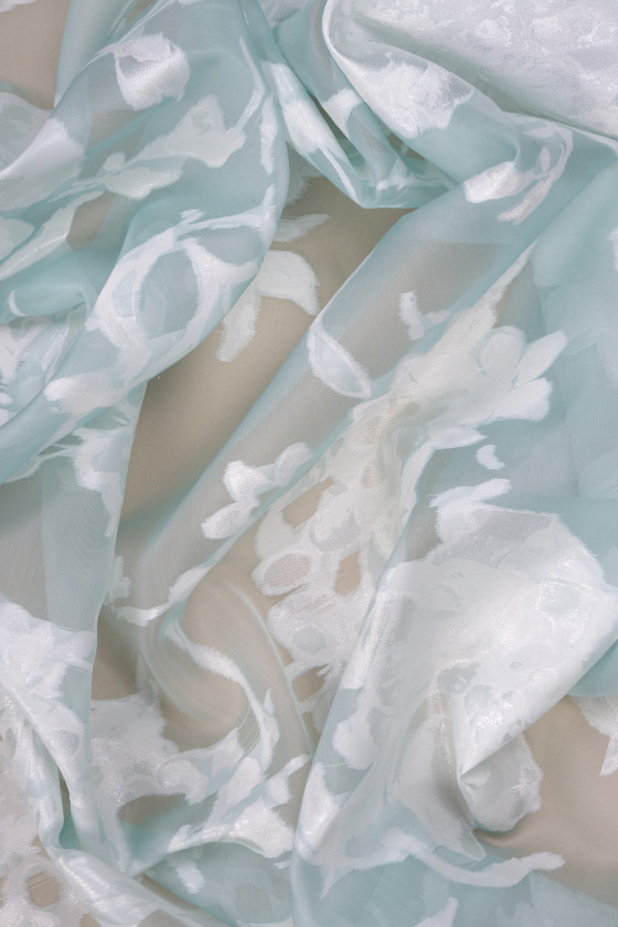 Itališkas organzos audinys mėtų spalvos su grietinėlės-sidabro, žakardo gėlių motyvu, dekoruotas blizgančiu siūlu. Audinys yra plonas, skaidrus, neelastingas, šiek tiek standus. Puikiai tinka suknelės ar sijono siuvimui.