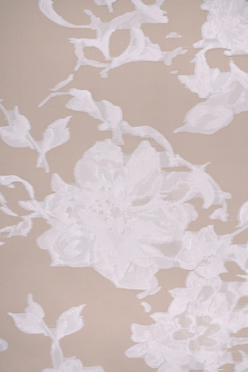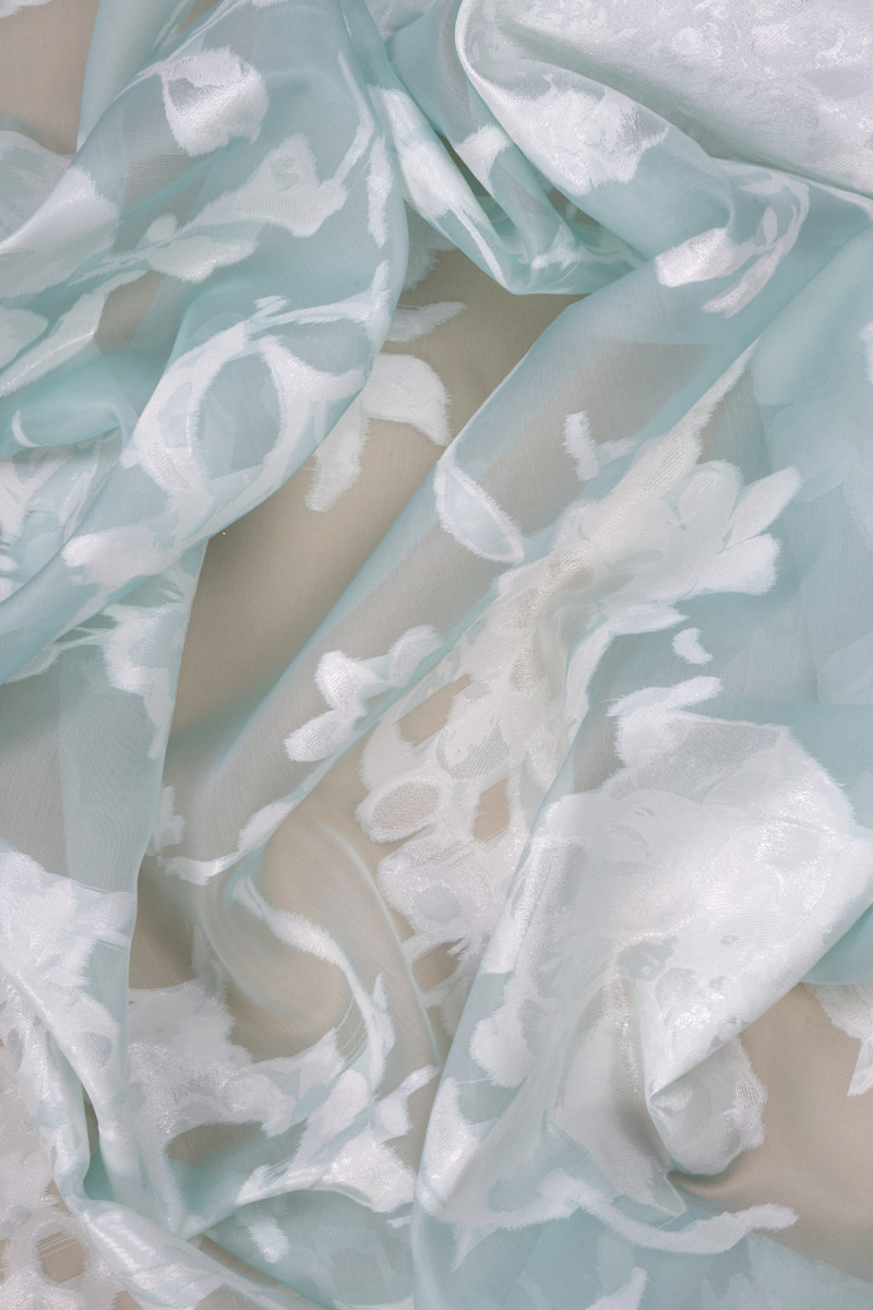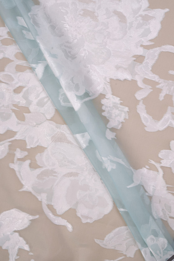 Itališkas organzos audinys mėtų spalvos su grietinėlės-sidabro, žakardo gėlių motyvu, dekoruotas blizgančiu siūlu.